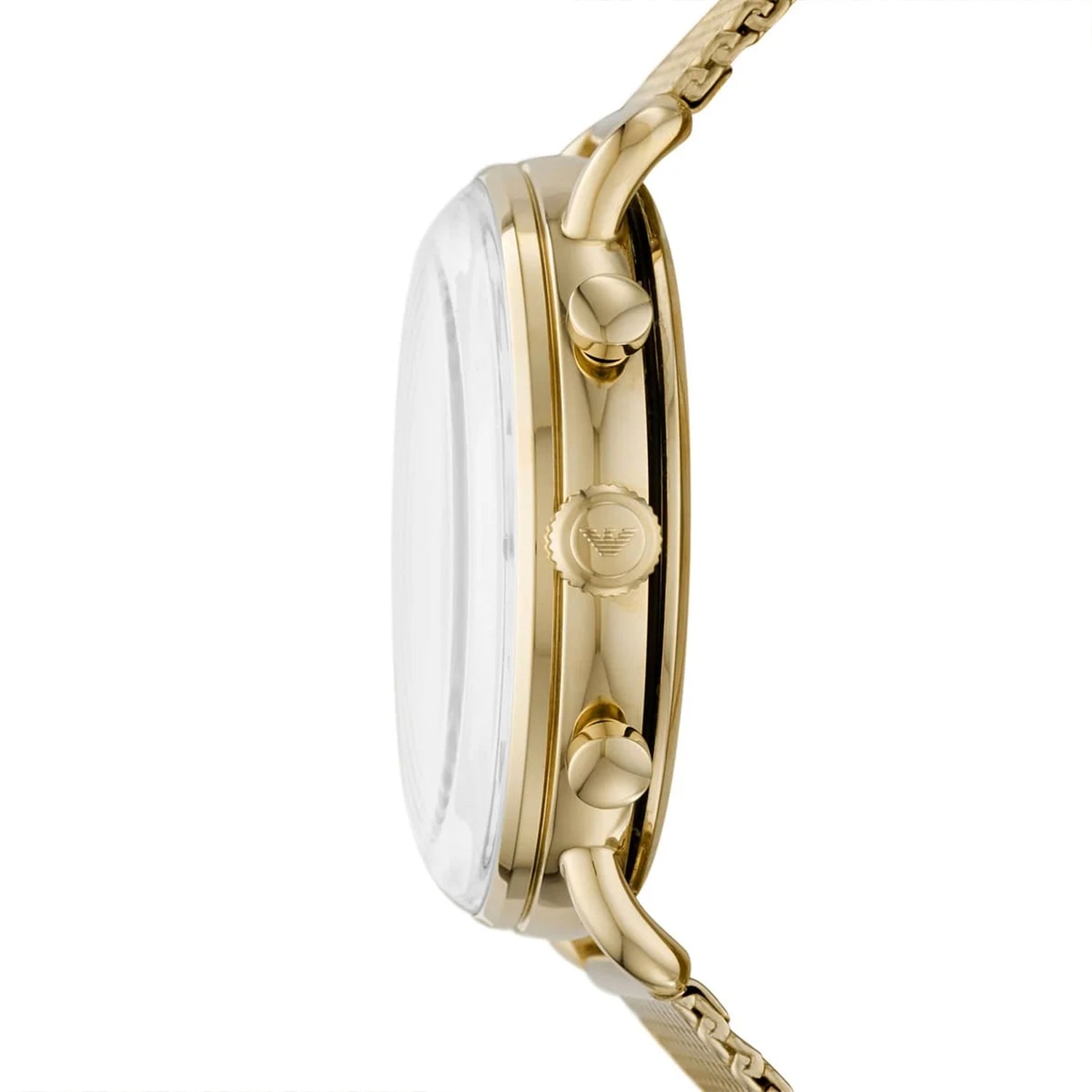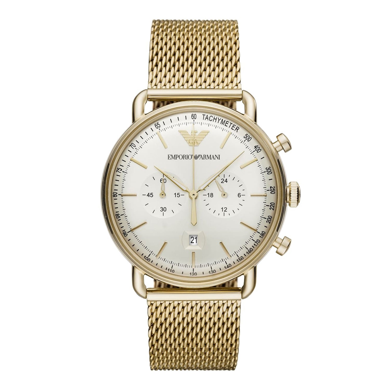 The AR11315 Aviator Chronograph Men's Watch features a gold stainless steel construction, merging precise craftsmanship with an elegant gold tone. This timepiece delivers both durability and refined style, perfect for those with a keen eye for quality and detail.