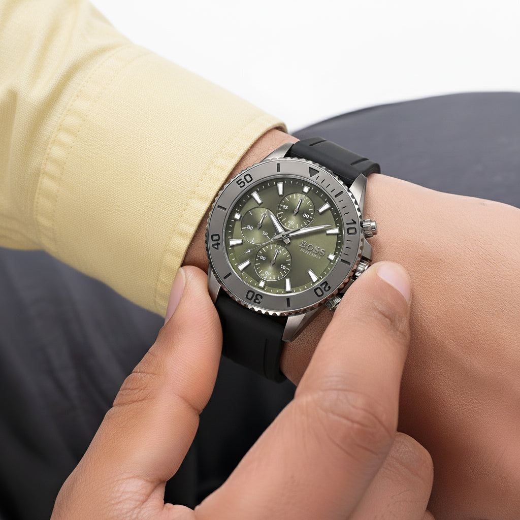 ساعة هوغو بوس كرونوغراف للرجال هي ساعة لا غنى عنها لأي رجل عصري. بفضل حزامها المصنوع من السيليكون الأنيق ولون قرصها الزيتي الأنيق، تتميز هذه الساعة بالأناقة والرقي. مثالية لأي مناسبة، كما أنها مزودة بخصائص كرونوغراف لمزيد من الوظائف. ارتقِ بمظهرك مع هذه الساعة المصنوعة بخبرة.