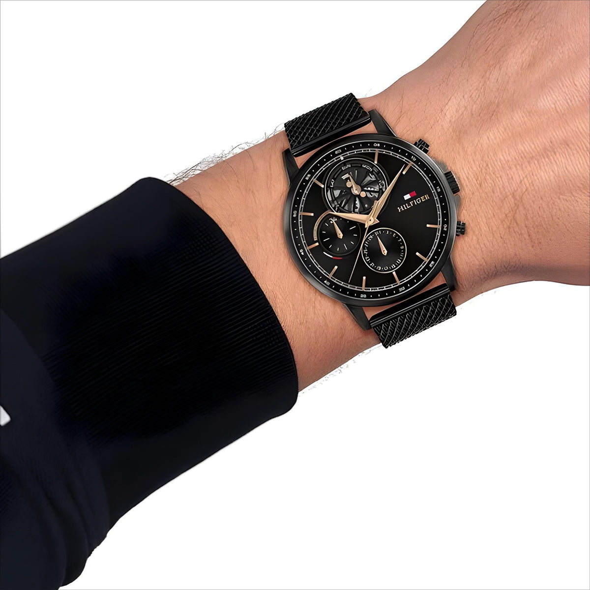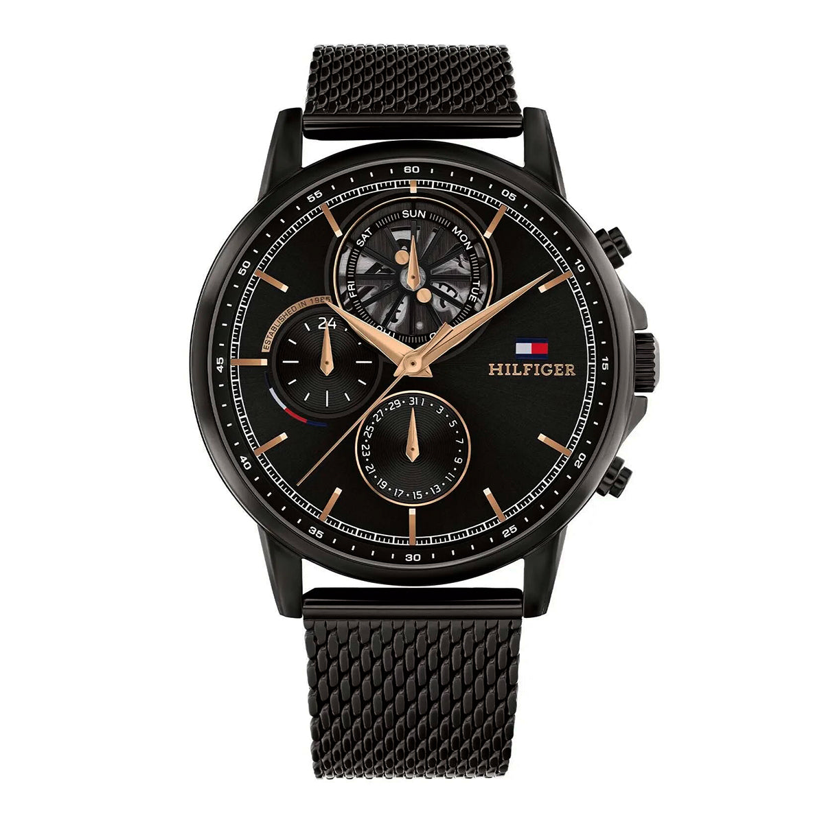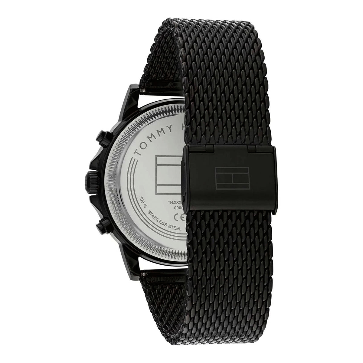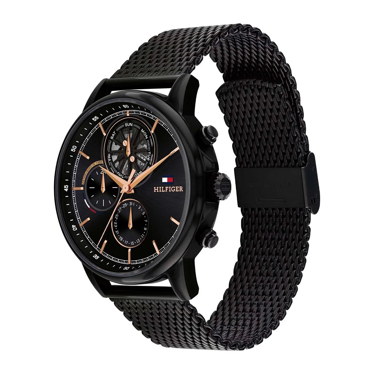ساعة تومي هيلفيغر بمينا سوداء وسوار من الفولاذ المقاوم للصدأ