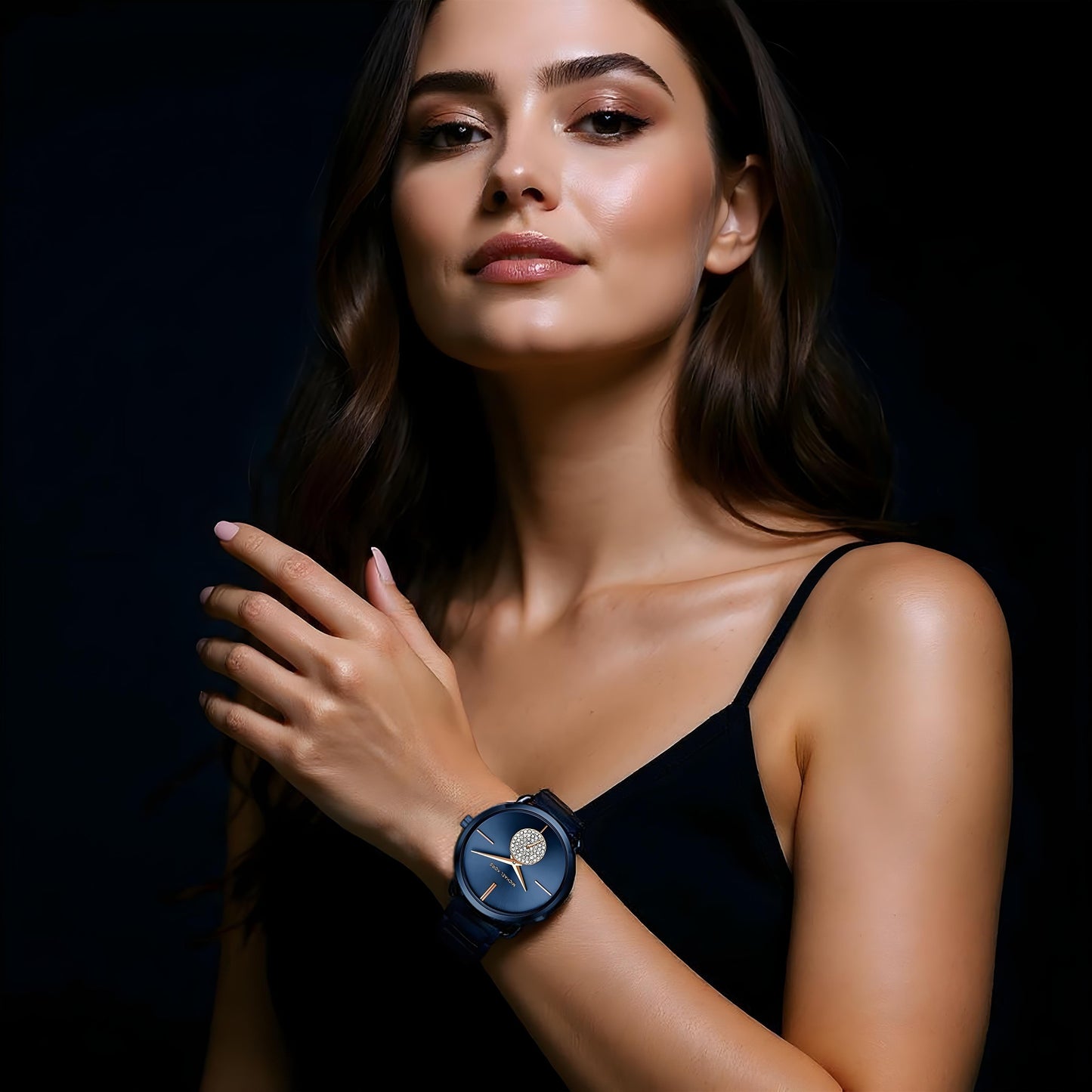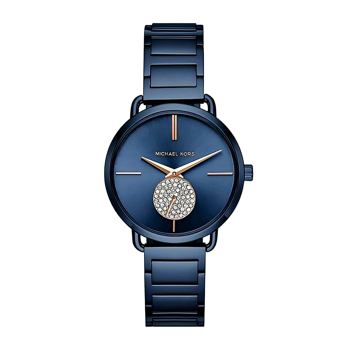 This Michael Kors wristwatch is perfect for a fashionable woman on the go. Featuring a blue-tone stainless steel construction and a signature logo dial, this classic design is sure to stand the test of time. The elegant detailing ensures sophisticated style that will turn heads.